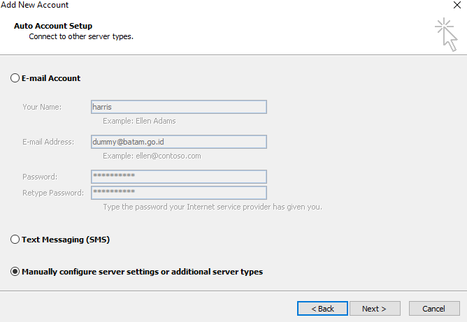 3. pada jendela add new account pilih opsi Manually Configure Server settings or additional server settings