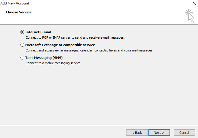 4. selanjutnya, add new account, pada pilihan choose service, pilih Internet E-mail